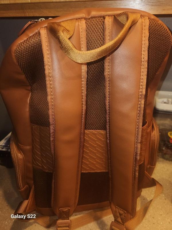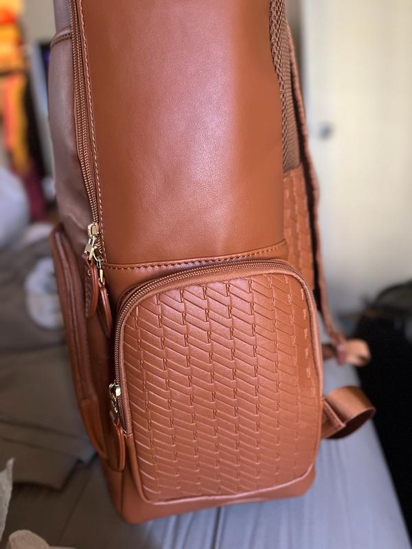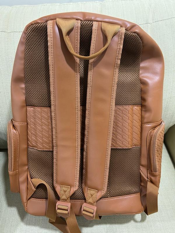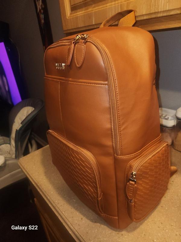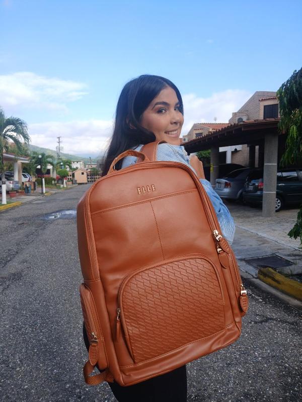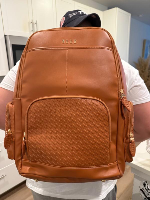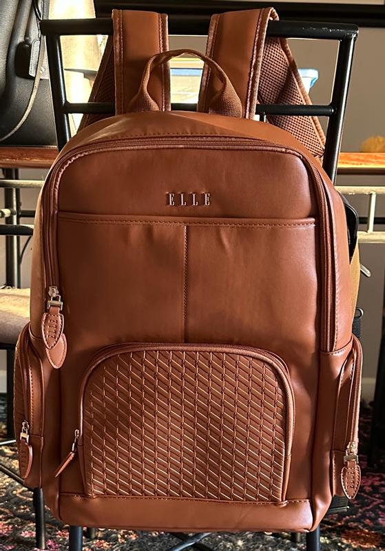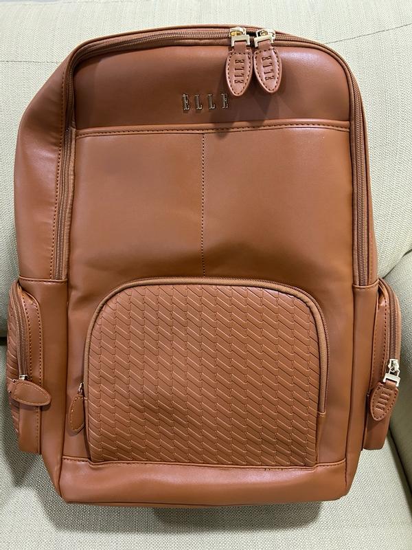 The Elle leisure luxe vegan leather backpack This is a great bag with a nice smooth feel to it and very spacious ,inside and out and can be used as a stylish weekender getaway or school backbag, it also has compartments for ipad, laptop cellphone and chargers. The backpack has a strap on the bag to slide down the handle of luggage also or two steps to wear as the standard backpackThis backpack comes in other colors . I do recommend this bag
