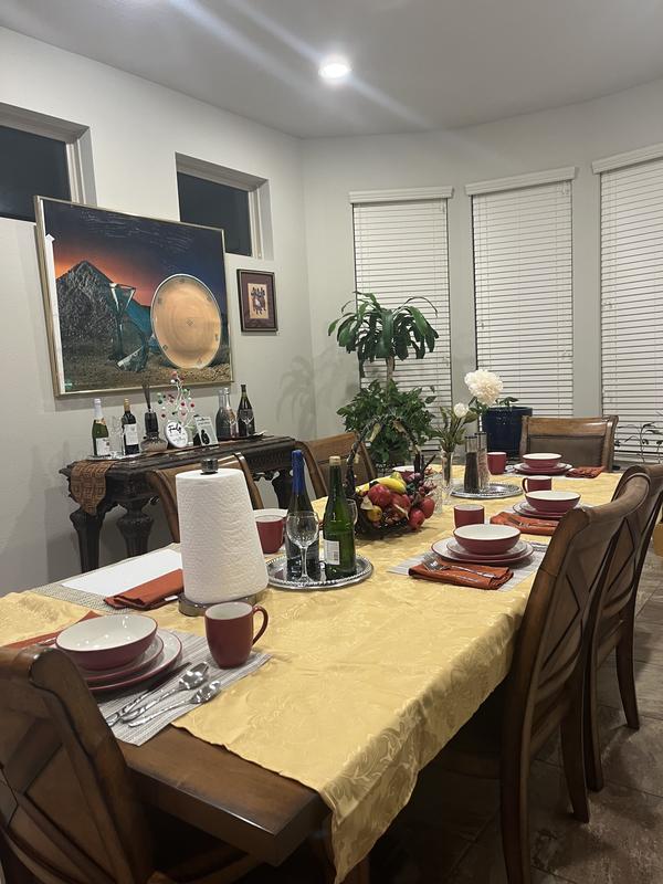 This elegant tablecloth from Macy’s is rich in color, and I chose the gold one. After washing, it came out of the dryer perfectly smooth and wrinkle-free.