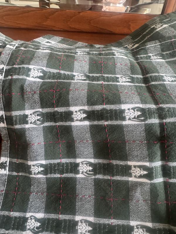 Purchased this table cover and napkins for the holidays. My table looked beautiful. Napkins were folded like a tree and placed on top of white china. Looked fantastic. No noticeable wrinkles at all coming out of package. Only problem is, I am trying to buy another package of napkins and cannot find them in stock anywhere.
