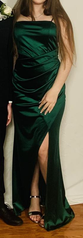 The emerald color looks as great as advertised. Fits true to size: I'm 5'3" & 130 lbs and a medium fit perfectly (my measurements are 36", 28", 35"). It's pretty stretchy so a couple inches above or below would be fine. However, it is VERY long. If you're on the shorter side, you'll need to hem it. I hemmed it 4.5 inches so I could wear 3in heels.