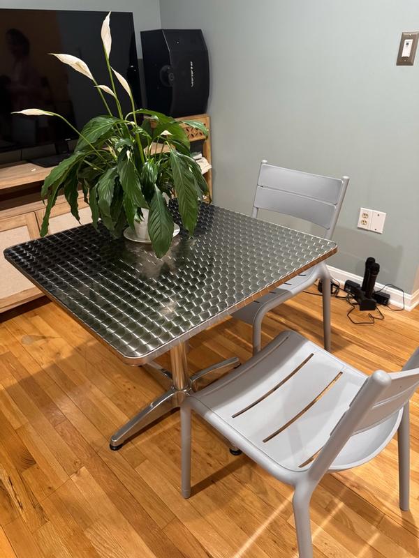 I really like this table for both indoor and outdoor use. The aluminum construction feels sturdy and well made, and the base keeps the table stable even on uneven surfaces. The square size is perfect for small spaces like a patio, balcony, or kitchen corner. It’s lightweight enough to move around easily, but still feels durable and secure. Assembly was simple and didn’t take much time. Overall, it’s a versatile and practical table that looks clean and modern.