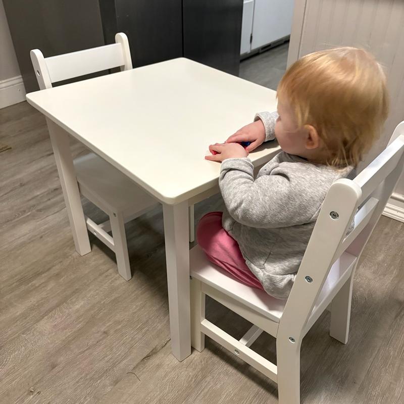 With our great niece now a toddler, and more kiddos sure to come, we saw the benefit of having this table and chair set in our home. This set reminded me of the chairs we have in the preschool rooms at church. Those chairs have been there since before I was that age. Knowing that they have held up well for decades, I knew this solid wood kids' set would too. Most adults can sit on these chairs, without any worry of a weight capacity…being able to sit that low and still be able to stand up is a whole different story! It's a heavy weight, solid wood set. It is such a well-made piece and will last for generations. Putting it together didn't take long, though having an extra pair of hands to help made it easier. The size is just right for little kids. This set fits well in a corner of our great room. It gives us extra seating for kids, without having to set up folding tables. It’s also easy to clean, which is a must with toddlers. From prior experience with this style of kids' furniture, I have no doubts that it will be a set that will last.
