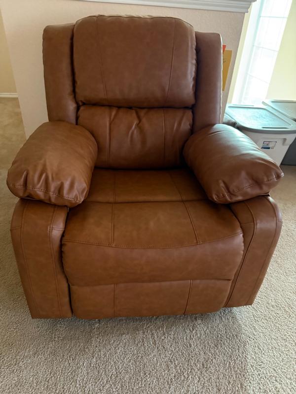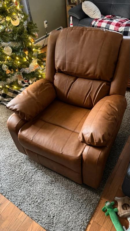 Love the color of the faux leather! It’s not an oversized recliner and fits perfectly in my townhouse. Wouldn’t be great for someone super tall, but perfect for someone who is average height! It’s pretty comfortable and I’d definitely recommend it if you’re looking for a comfy chair to put in a smaller space! Pretty easy to assemble as well!