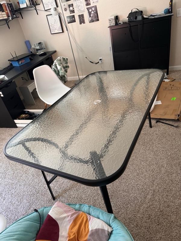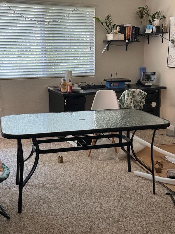 Tala Rectangular Tempered Glass Top Patio Table With Umbrella Hole And Black Steel Tube Frame