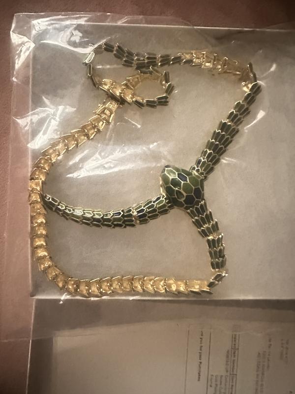 I love snake themed jewelry, and I am always looking out for an interesting piece. This necklace does not disappoint! I am so pleased with it's construction, quality, and beauty, and its attention to detail. It has a nice weight to it, and rests flush over my collarbone. The clasp feels very secure. The enamel colors are nice and vivid, and the gold plating is bright and shiny. I plan to wear it for dressy occasions, as well as casual. I absolutely love this necklace...