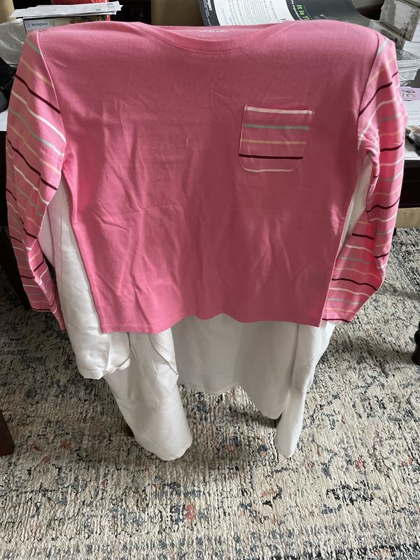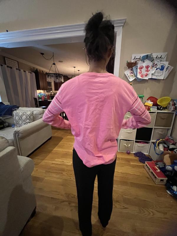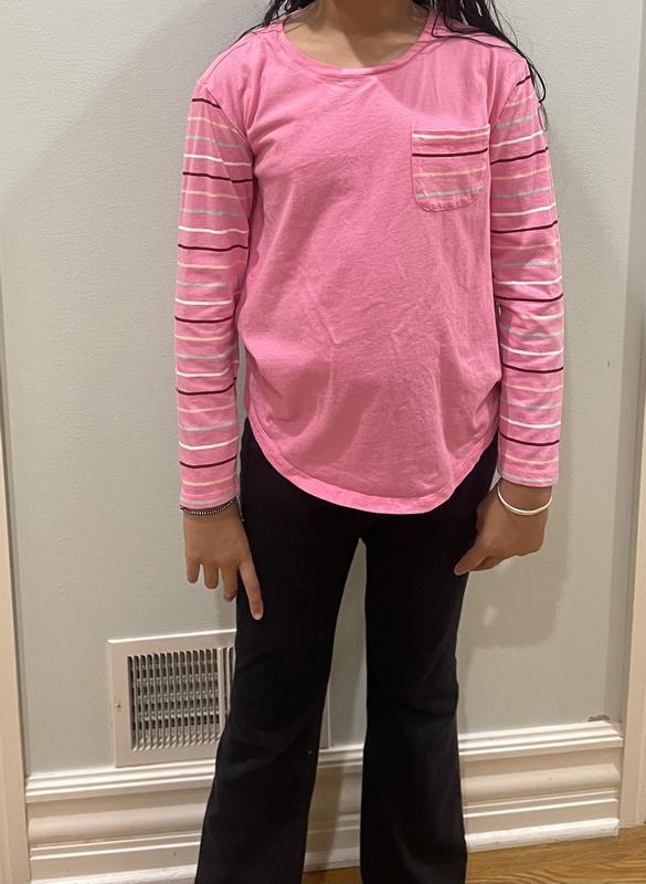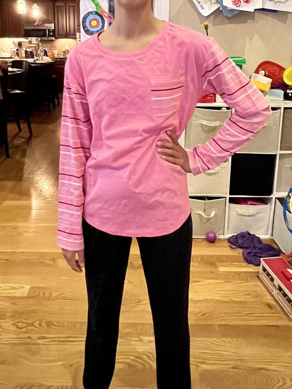 Basic pink long sleeve t shirt. Colors are not great. Pink is more pepto bismal color. Thin material, so appropriate for cool days, not cold. Pocket on the front with stripes. Sleeves are just above the wrist.