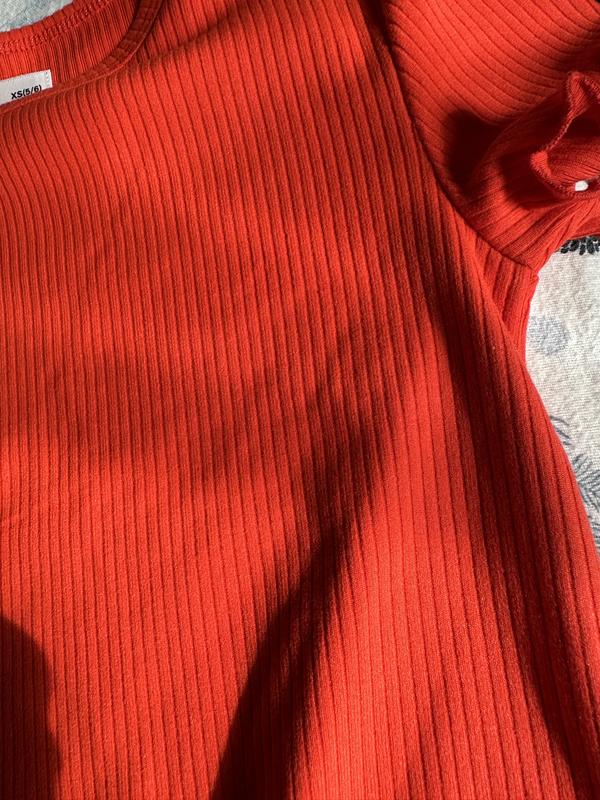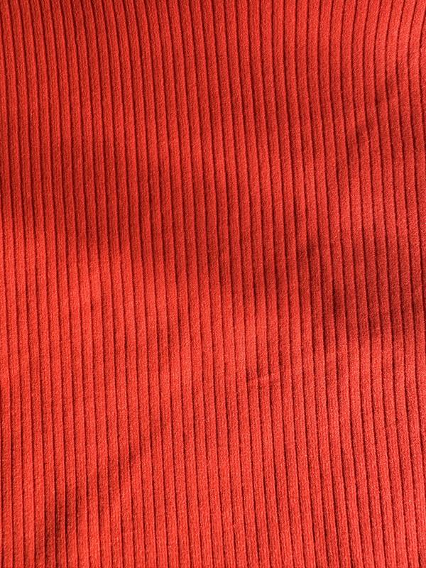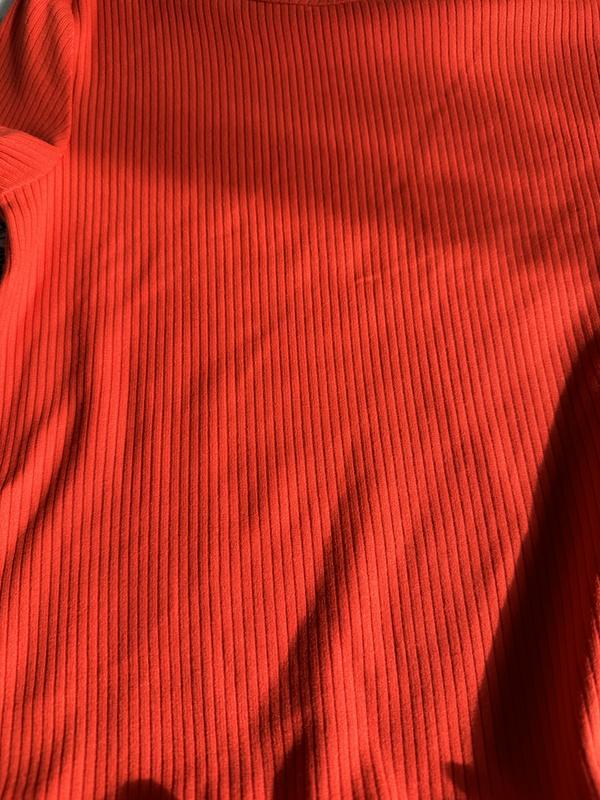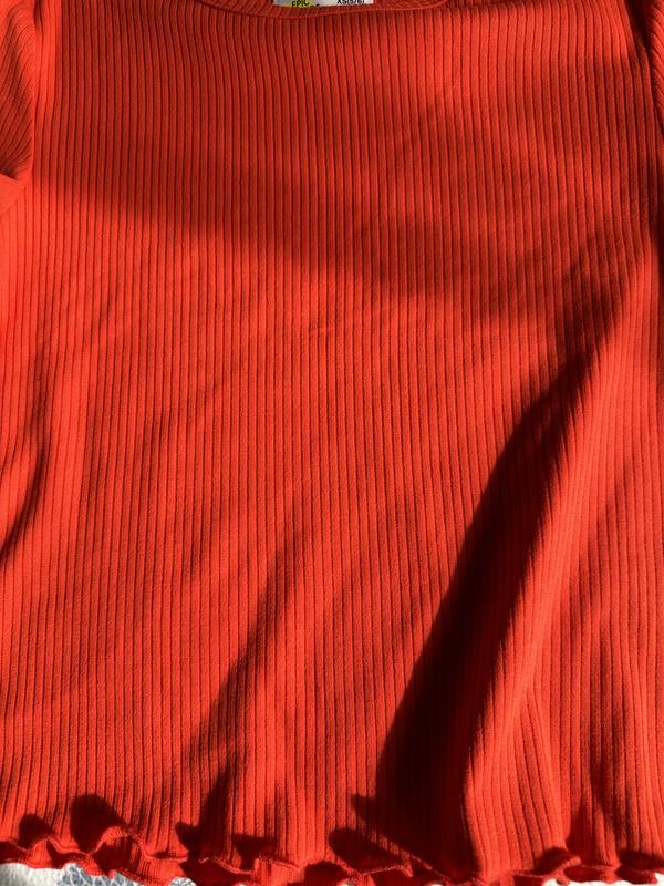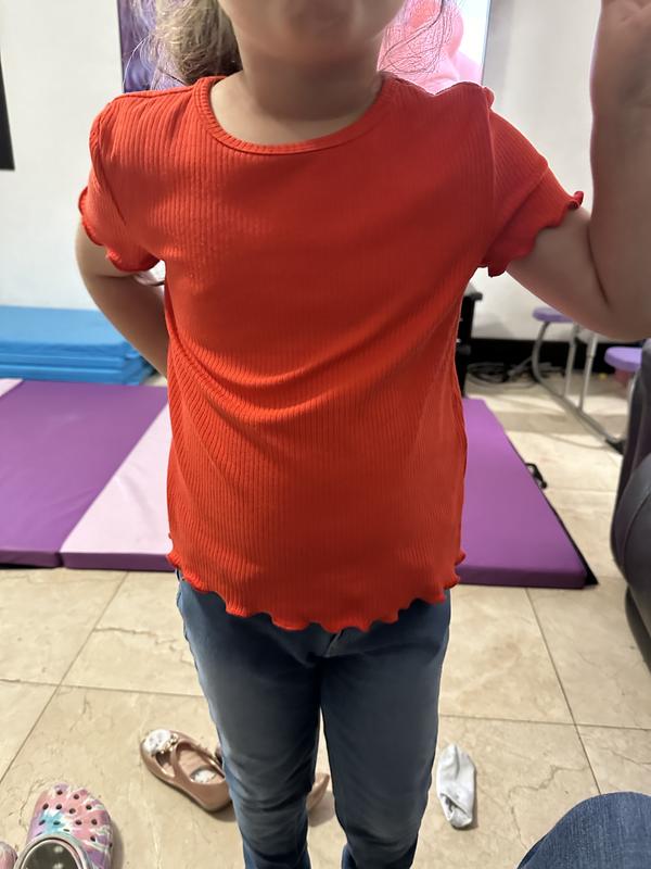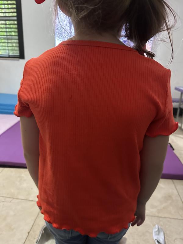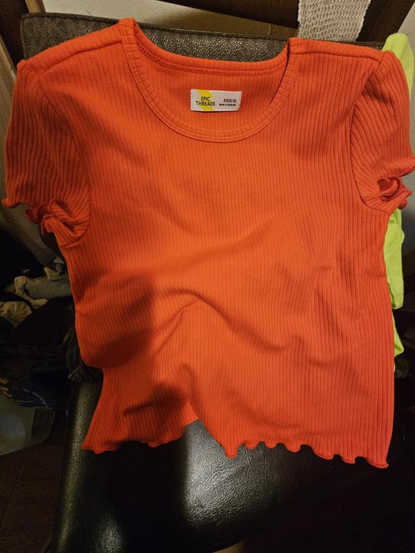 I really like the quality of this shirt. It fits my daughter perfectly. The best part is the stretch it has to it. Since crop tops usually seem to stay in style, as she grows out of it she can easily use it as a crop top as well. The color is more of an orange red compared to what is shown in the photo.