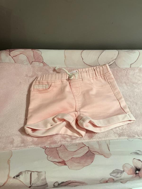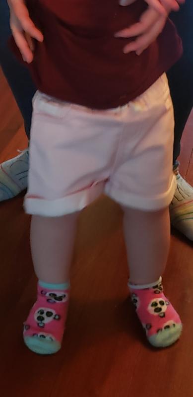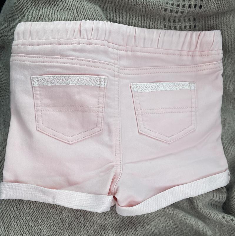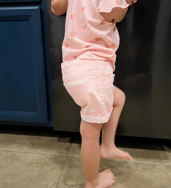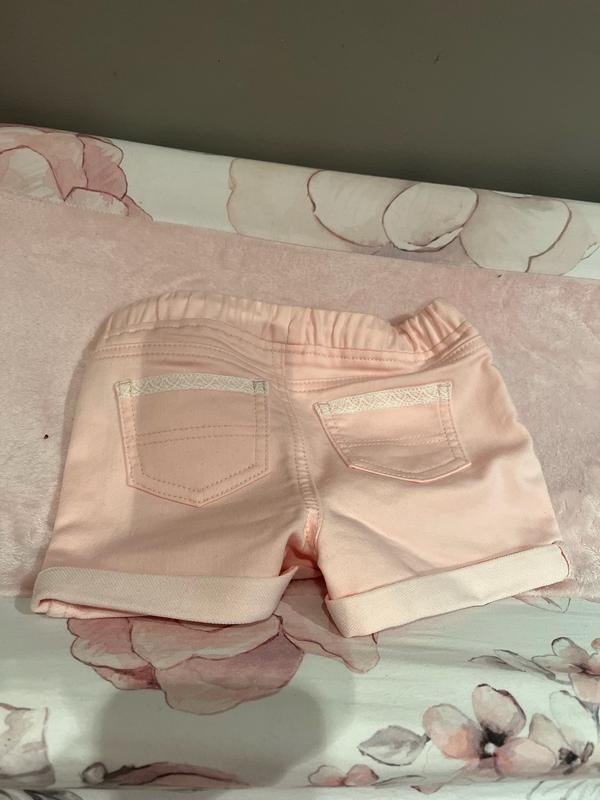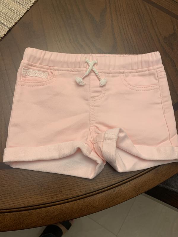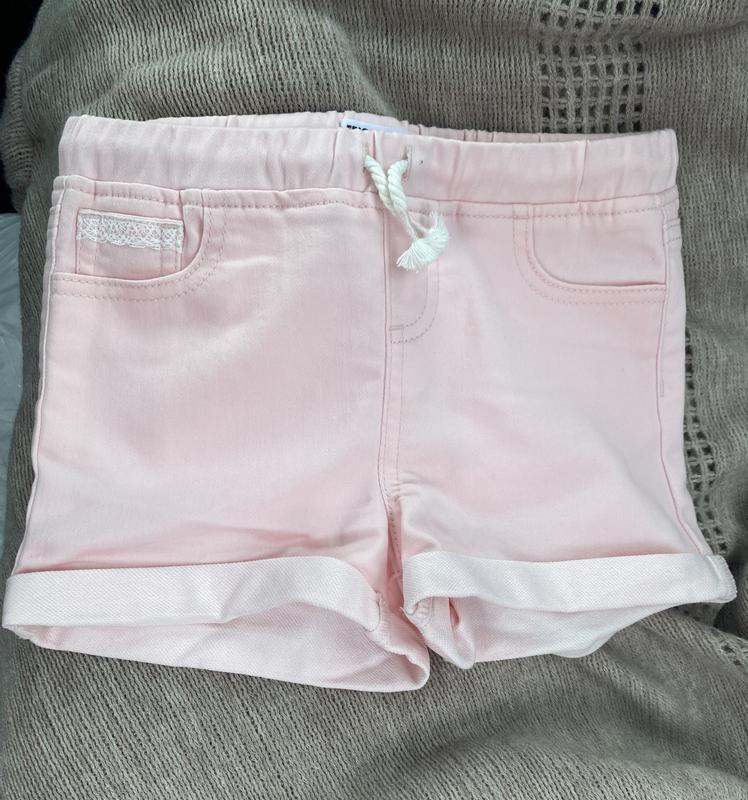 KIDS PINK ROLL CUFF SHORT Pro: The Epic Threads shorts are very cute with the lace lined back pockets and lace on one of the pockets in the front. The fabric is nice as well as the pink color. I think that they will wash well. Con: The elastic in the waist was minimal and the draw string did not hold up the shorts. But I think they will fit nicely for toddlers a little chunkier than my grandchild.