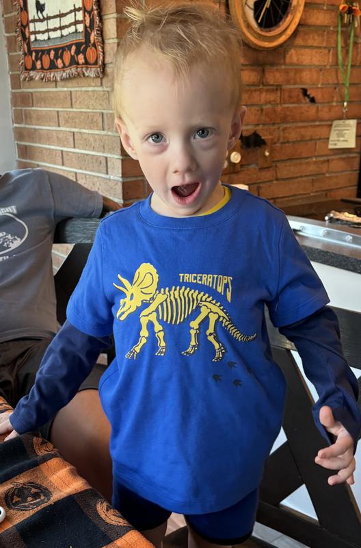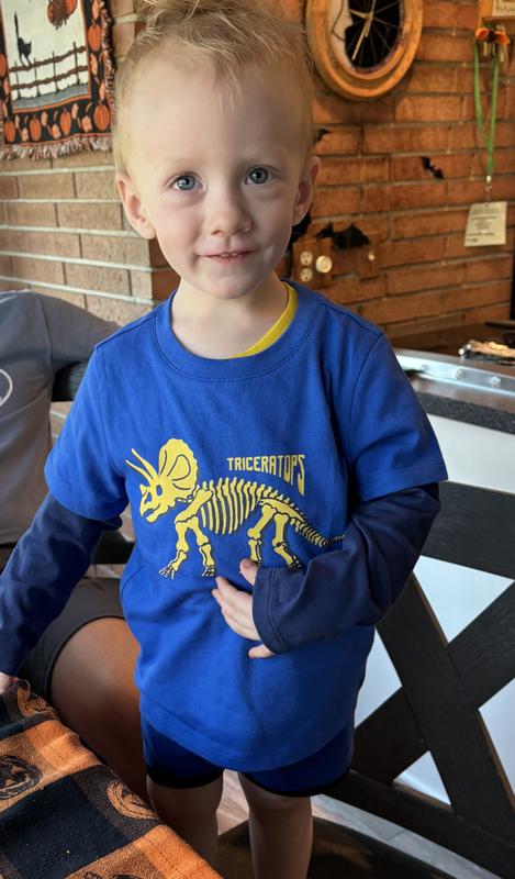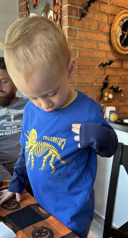 My grandson was thrilled with this long sleeve shirt. He was excited when he saw the dinosaur and he loved the colors. I was happy with the material and quality of the product. The tee washed well and kept it shape and colors did not fade.