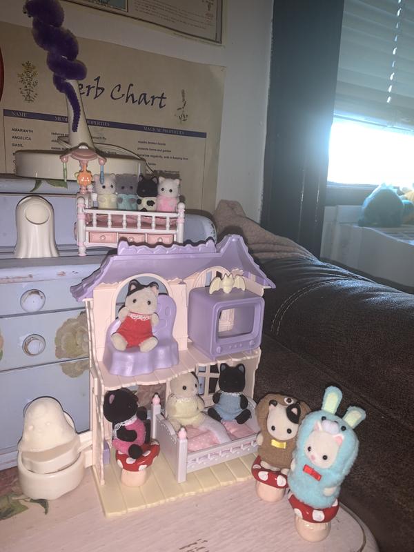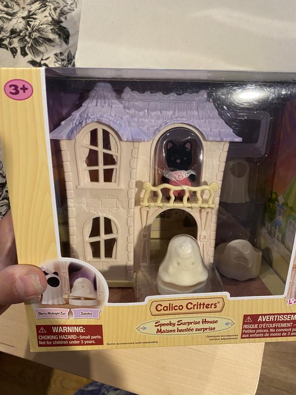The Spooky Surprise House is super cute. I love all the ghastly details. I was surprised to discover that the ghost figure is flocked! What a fun detail! Also, the house is larger than I expected (sure, it's still small/no Cozy Cottage, but there is ample space for critters to play inside). I like how the TV screen is open, too, and the ghost sofa is fun and cute.