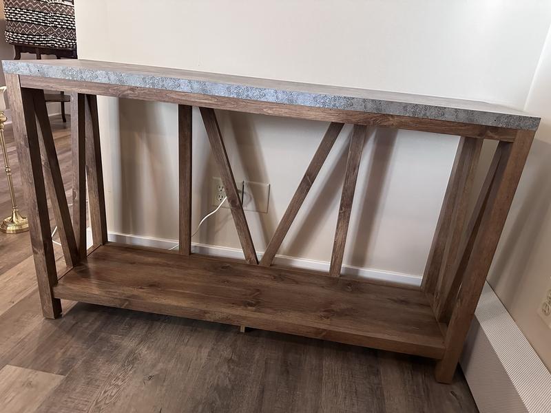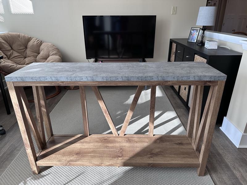 We love this entryway table! It’s beautiful, I love the colors and it will be great to help organize some things in our living room. We got the concrete style top and it looks great in person. It’s high quality and looks great in our space. It shipped quickly as well.