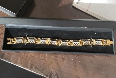 The gold and black tone with diamond accents make this piece of jewelry elegant and masculine. Very classy for an evening out. My husband loved it!