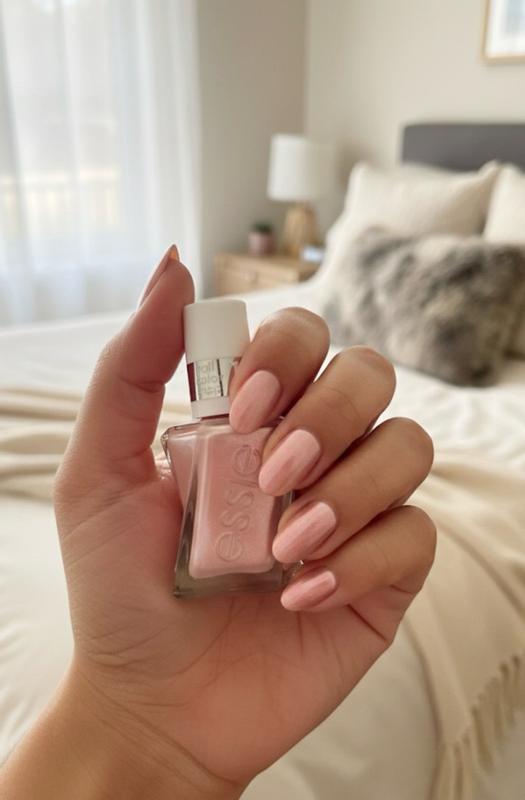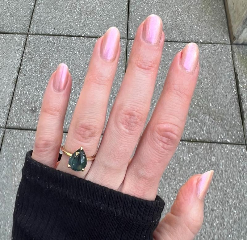 I love this color honestly. It’s a sheer pink with iridescence, and I most often wear varying shades of sheer pinks. It does however still start to chip after about five days. It also definitely still feels like a standard nail polish, it’s not a thick shell like UV gel. I appreciate that the line has its own top coat, I can try some other shades now too. I love the color but overall it performs similarly to standard polishes