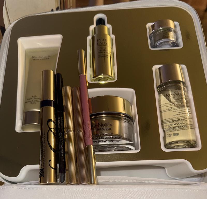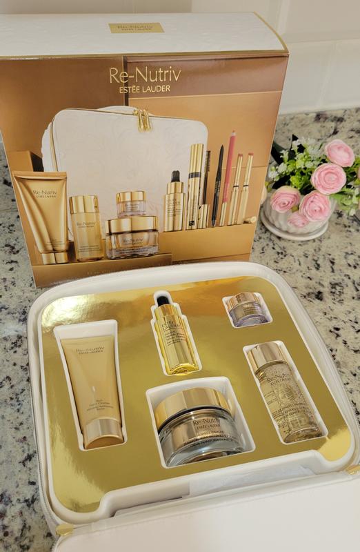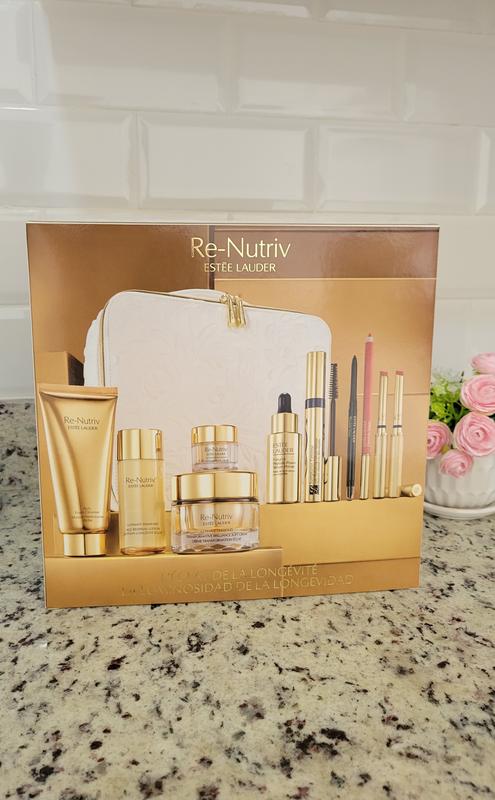 I was thrilled to receive this gift set, all of it scream elegance and luxury! The package and the train case that comes with the products are both elegant and gorgeous. It came with some many products, the main products are from the Re-Nutriv Ultimate Diamond line, the cream is full size, and the cleanser, lotion, and eye cream are a generous deluxe size. I loved that it included in full size the primer, eyeliner, mascara, lip liner, matte lipstick and shiny lipstick. The cleanser is a foam one, lather quickly and my skin felt cleaned and not striped, the lotion felt silky, smoothing, with a nice finish, the eye cream is very hydrating, but didn't felt sticky or heavy. The cream is very rich, with a satin texture, leaved my skin instantly hydrated, plumped and radiant, I've notice improvement in dark spots. All the skincare products had a light and not overwhelming fragrance that i liked. "I received this product for free from Estee Lauder for testing and review purposes.”
