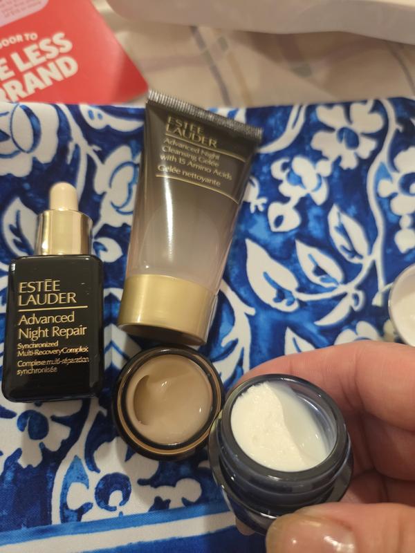 I love the night repair serum. I’ve been using it for years. The set includes a tiny one that only last for a week (a little disappointed about this).Not to mention the one that comes is the gift for purchase set. I’ve tried the other products in the set. The cleanser is good. The eye gel it absorbs great and leaves the eye area smooth, not oily. I also liked how the face cream absorbs and leaves skin hydrated. I think it’s just a little overpriced for the sizes. However, I was pleased to be able to get the gift with purchase. Although, the trials are so tiny, the bag is so beautiful and functional to carry stuff when traveling.