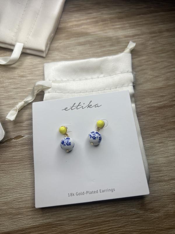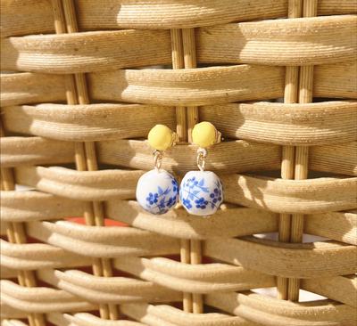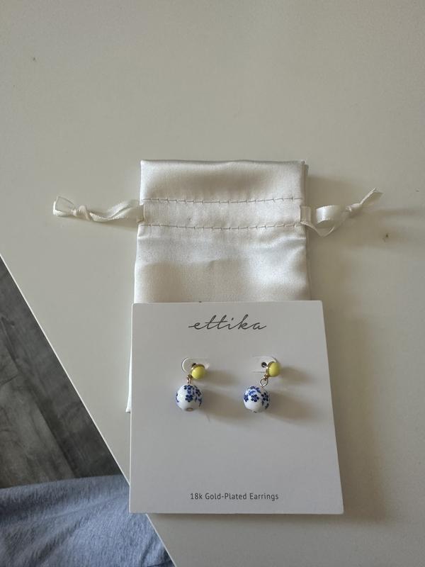 These earring are super cute. I love the indigo floral design all over the bead. They are very ligt and dangle nicely on the ear and looks good with a lot of colors. I loved these!