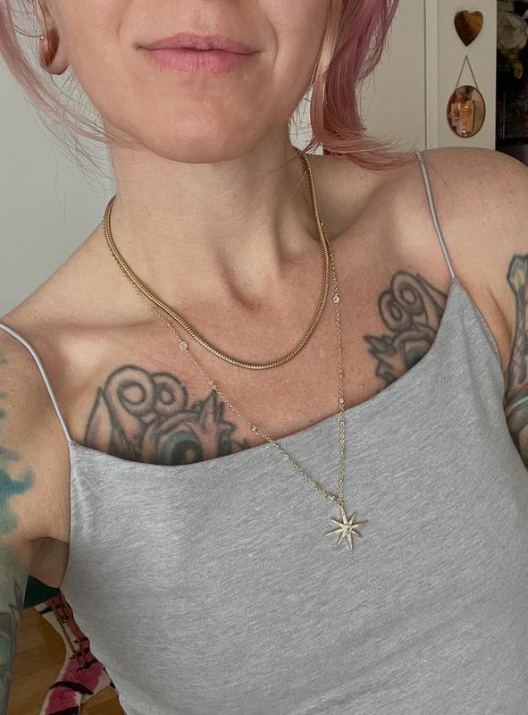 I love this necklace! It's the perfect length while also being dainty. The sparkle is subtle but elevated any look. I wear it with dresses, t-shirts, everything! Lightweight, sturdy, and so so pretty. Highly recommended for layering with other necklaces!