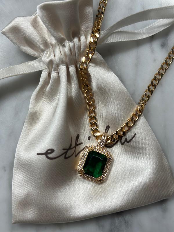 Emerald Stone Pendant 18K Gold Plated Link Necklace