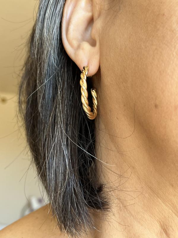I love these hoops for everyday wear! They are super lightweight and a perfect size. The twisted detail also gives it a more interesting design than your average hoop earring!