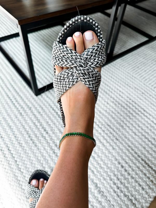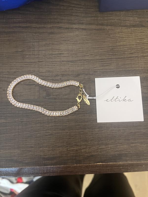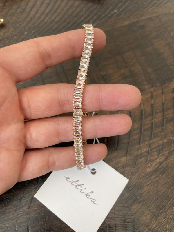 This baguette cut anklet is beautiful. I have the emerald one and it's just so different than any other anklet I have owned. Can be worn to elevate a sneaker, with sandals, heels, barefoot. It is also comfortable and has an adjustable clasp. I have teeny ankles and struggle to find ones that stay in place and don't slide down to my foot. This one fits great! As with all ettika pieces, the quality is so good.