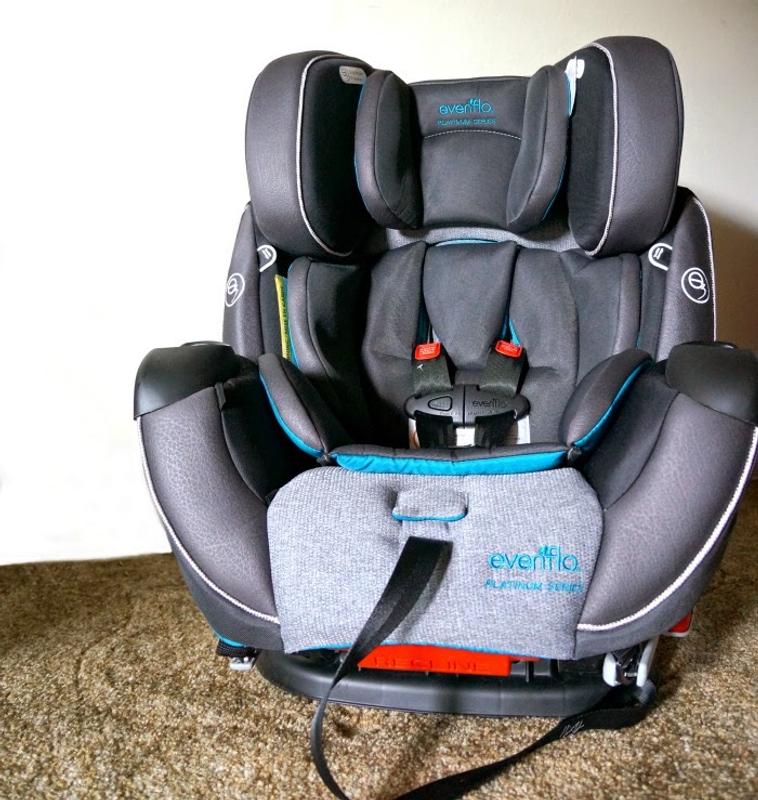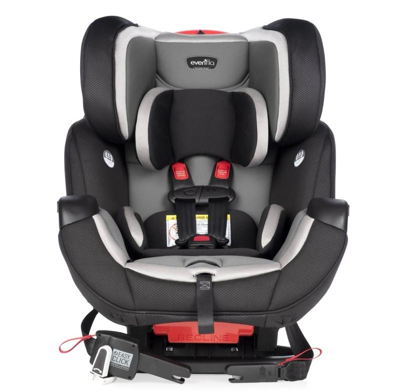 he Evenflo Platinum Symphony DLX in Castle Rock is an impressive all-in-one car seat that combines safety, comfort, and longevity in a sleek, neutral design. It fits children from 5 to 110 lbs across three modes (rear-facing, forward harness, and belt-positioning booster), so it really “grows” with your child over the years. Many users praise its EasyClick / SureLATCH installation system, which helps achieve a more secure, stable fit with less hassle.  The Castle Rock upholstery is often described as durable and easy to wipe clean, which is a practical bonus for daily use.  Some features that stand out include buckle pockets (to prevent hot buckle contact), no-rethread harness adjustments, and good side-impact protection.  On the downside, as with many all-in-one seats, it is somewhat bulky and can be heavy to move between vehicles. Overall, though, it presents excellent value for parents wanting one reliable seat to last through many stages.