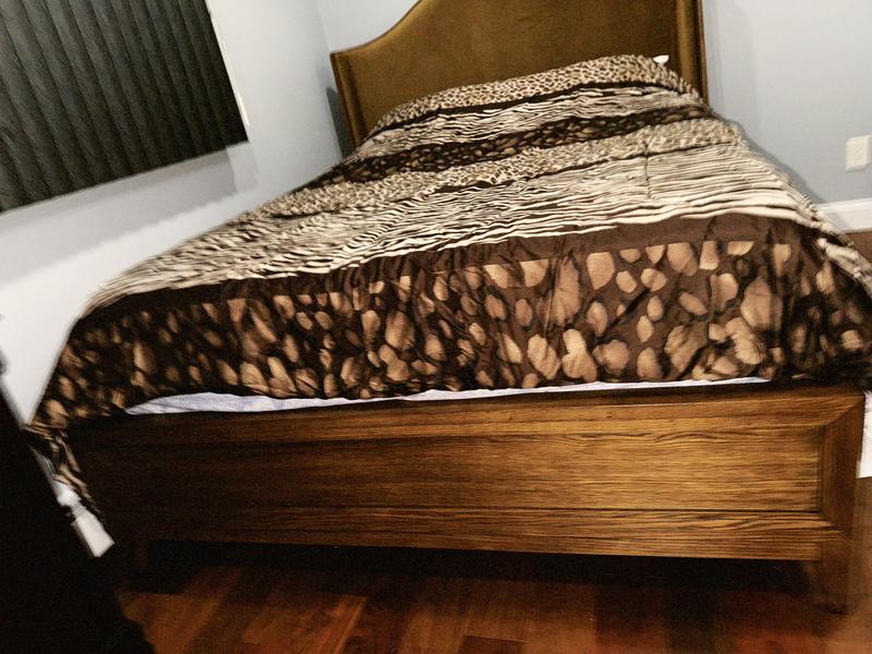 This queen bed is amazing! The quality is great and it is extremely sturdy and solidly built. The headboard has a beautiful neutral velvet that is soft to the touch and I love the slight curve. My queen mattress fit perfectly inside the box frame as well. I would definitely recommend this brand. The neutral toned wood fits into any type of style and updates my bedroom’s transitional look. Great quality and a great appearance!
