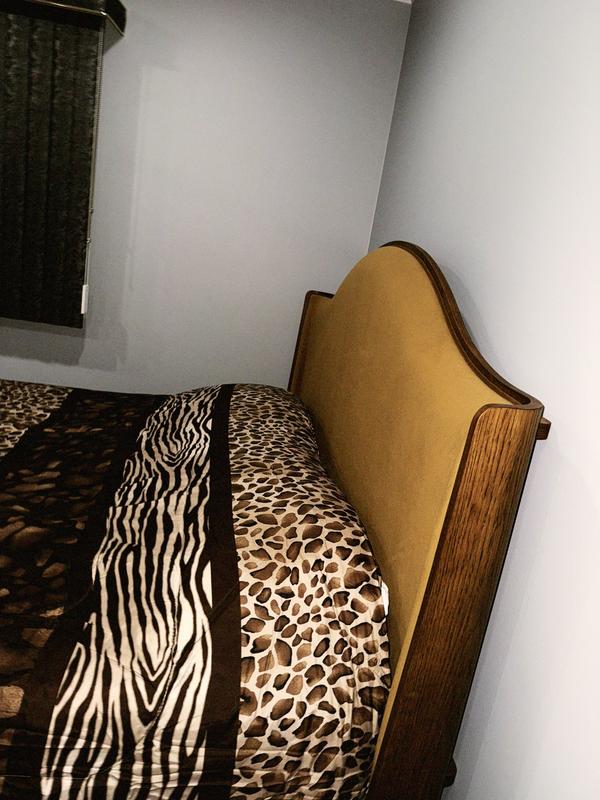 This beautiful oak wood bed frame with a brown headboard feels high quality. The frame is sturdy and the fabric on the headboard feels so soft. The color of the frame is classic and looks like the pictures and will go well with all different colors. Assembly was done by a professional in 20 minutes. I highly recommend this elegant bed frame!