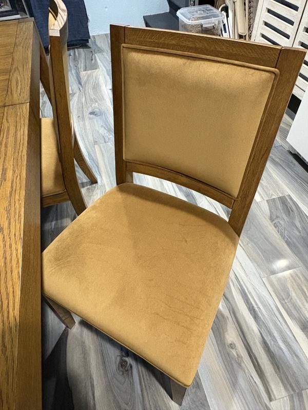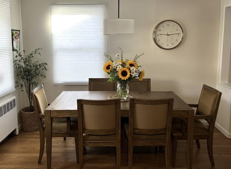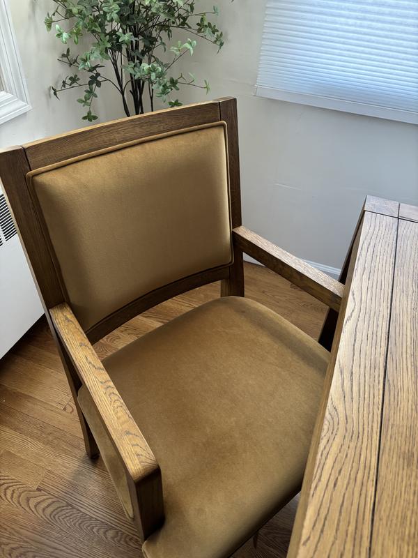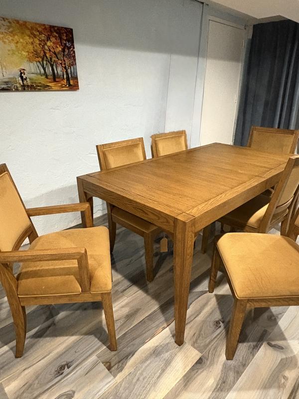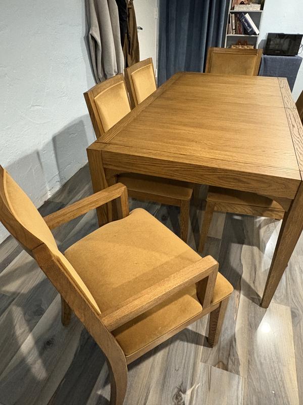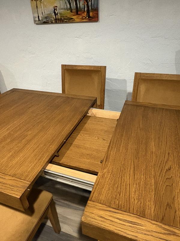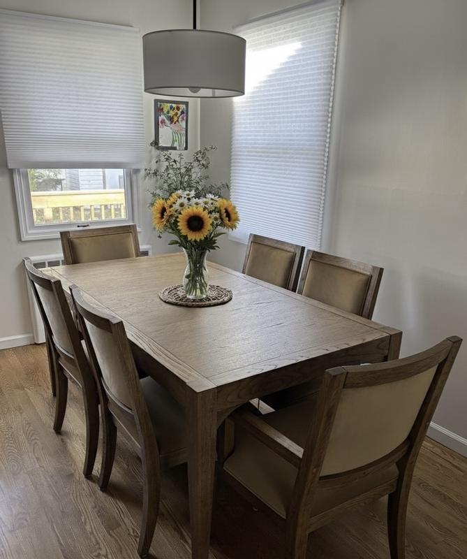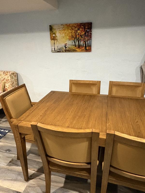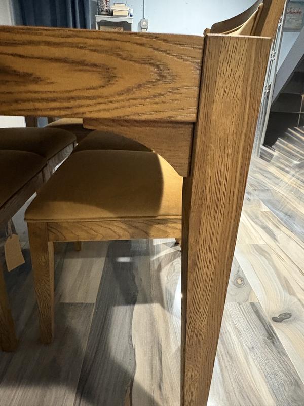 The Everleigh dining table is beautiful! It’s classic while also being modern. The table is both versatile and functional due to the expandable center leaf, allowing it to go from 66 inches in length, which seats six (comfortably) to 84 inches for eight people. It’s perfect for daily use and also for gatherings. The quality of the table is excellent. It is solid, sturdy and durable so far. It has a gorgeous oak wood grain finish. The matching chairs are so good! The upholstery is a rich golden color. The set comes with 4 side chairs and 2 arm chairs. The seats are very comfortable. Overall, this table has been a great addition to our dining space!