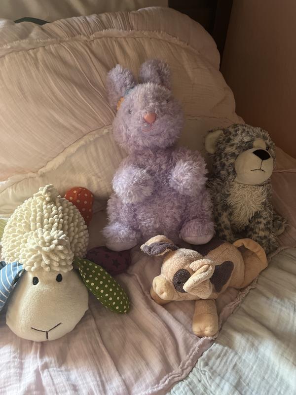 This bunny is adorable, soft, and perfectly fuzzy. The only problem is that I don't know if I prefer to display it on a shelf or let the baby adore it to death. Obviously the baby always wins out in the end.