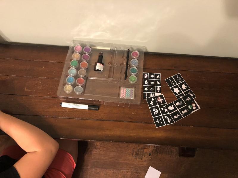 My daughter was so excited to see this when it arrived. We have used it a few times so far this summer, and I can say it has really been fun to use. It includes simple instructions, all supplies needed, and it is easy clean up. I only have one child, and she is very patient with me making sure I don't spill the glitter everywhere while applying different colors and gems and such. She loves going out with her glitter tattoos on, and it makes her feel like she has extra special face paint on. Super simple application, easy clean up, and easy to wash off!!