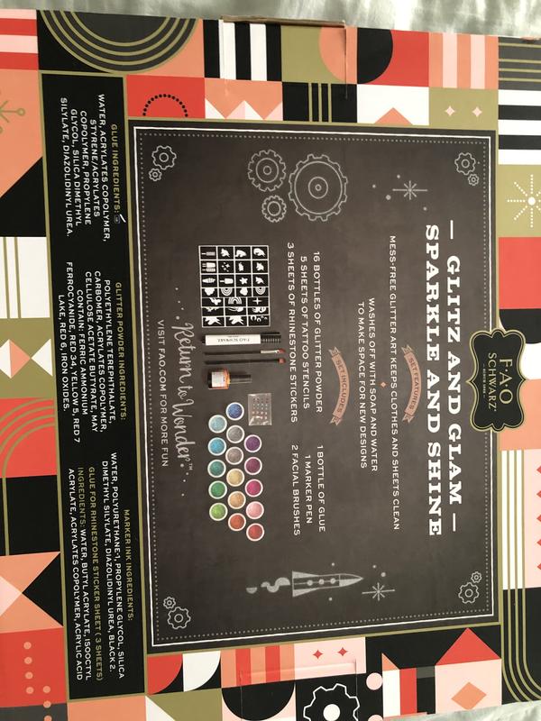 This is a very cute set with enough products to have good uses out of it. The glitter is bright and it actually adheres really well. The stencils are small, but worked without any issues. I recommend parental supervision and a place where you won't regret a mess because it can be messy and easy to spill glitter everywhere.