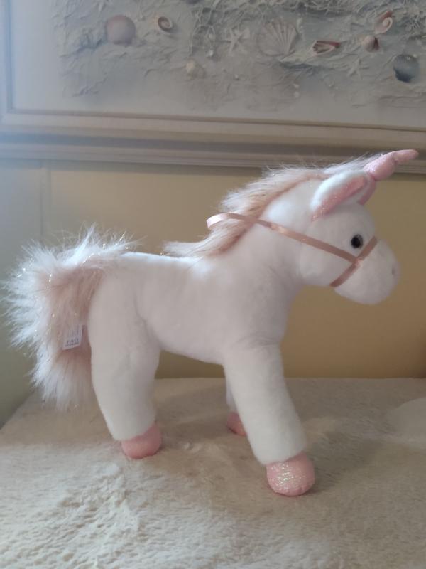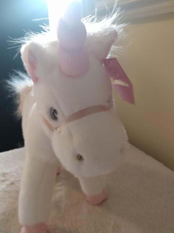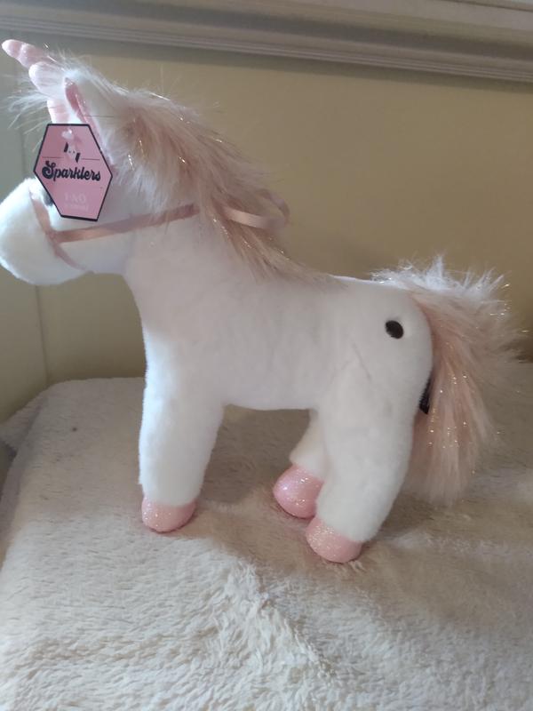 This is such a cute stuffed animal, my daughter loves it so much. Being the unicorn fan that my daughter is her eyes lit up when I brought this for her. It has her favorite colors on it and a touch of sparkle.