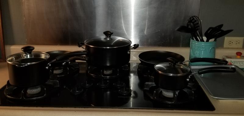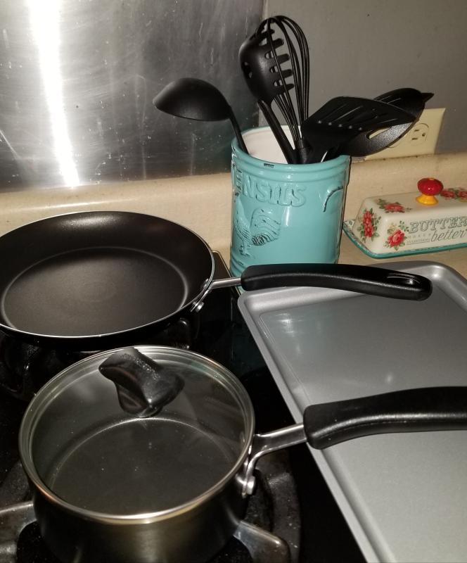 I love my new cookware set. Easy to clean, looks great, really nice quality and fun to use. I love the lid that drains liquid. What a time saver. I toss all my damaged pots and pans and feel fancy with my new cookware.