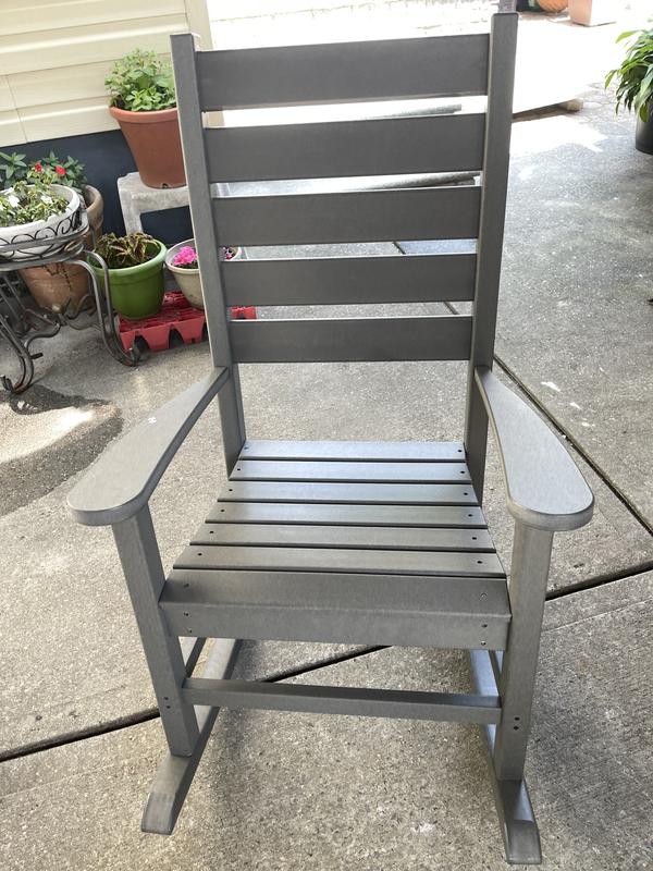 This rocking chair is so well made. It is very durable and a solid piece of furniture. I love that I can leave it outside without warping or rusting. The color is so vibrant and it goes well with my farmhouse outside decorations on my deck.