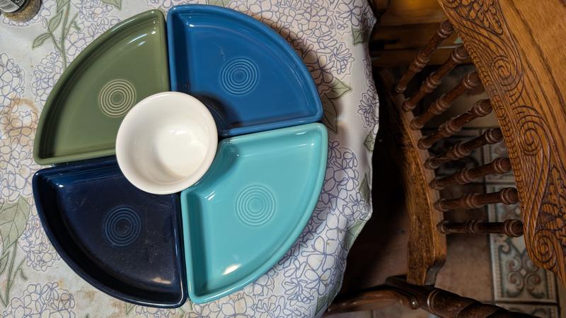Having been a Fiesta fanatic for many years - still have pieces my mom bought 80+ years ago - my banker - aka my husband - limits what I buy. But we were planning a special party with a self-serve antipasto bar, and this entertaining set was just thing. (Bought one in another color as well.) Filled the dishes with olives, little pickles, cherry tomatoes, cubed cheese and Mozzarella "pearls", and slices of salami. With Dijon mustard and German black bread on the side. Found extra long toothpicks and teeny forks for serving. People made their own kabobs! It was a big hit - could not keep the dishes filled fast enough. Another Fiesta hit!