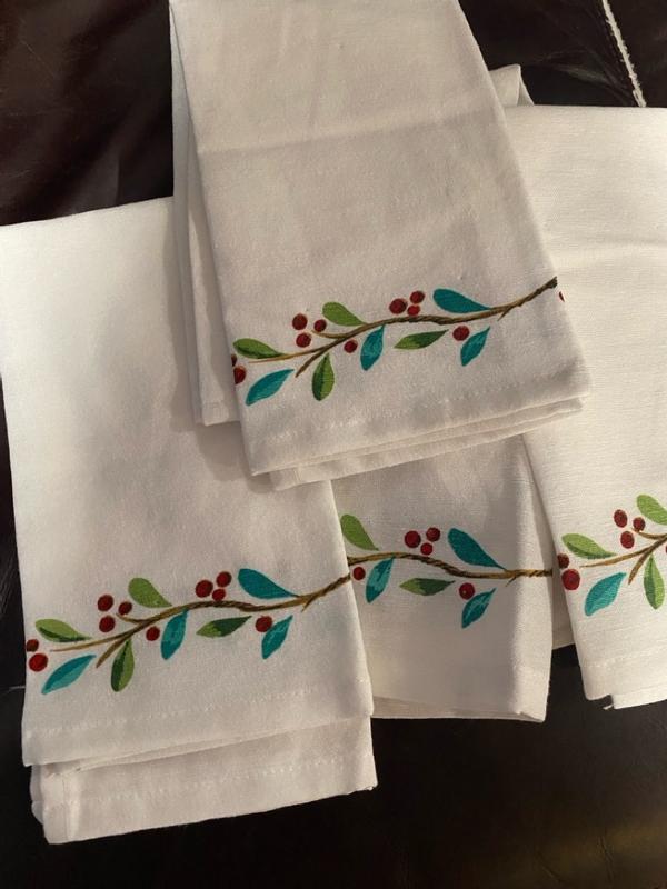 These napkins are very cute. The material seems durable and thick. The holly design would work great for Christmas but the teal leaves also make it so they’re not too Christmas-y. They did have a funky smell when they first arrived, but after going through the wash, they’re fine.