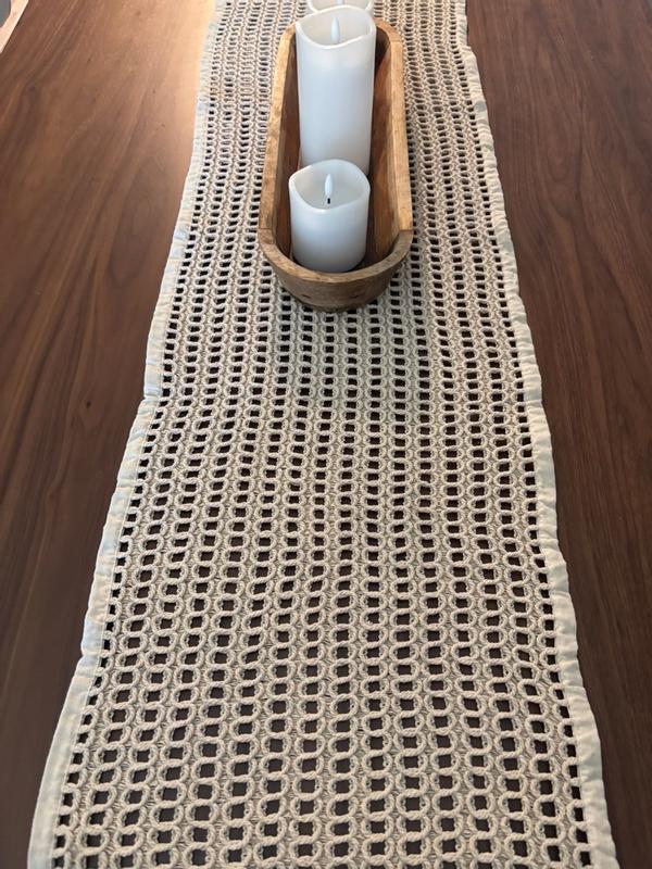 This table runner is gorgeous. It looks like it was homemade.  I love the neutral color and it seems very durable. I also love that I can wash it in the washer and that it is very large and I can fit it on my table when expanded as well.