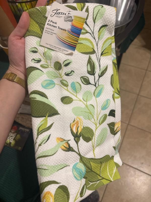 I love these towels! They have an adorable print that has withstood dirt, stains and washes. So far they have come out of the wash looking like a charm. The thing I like best is they are made from a nice quality 100% absorbent cotton, which is so hard to find. The color is beautiful and will go along side numerous Fiesta tableware colors.