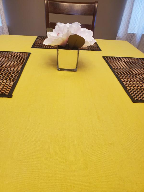 I got this a few weeks ago because it matched my kitchen but it snagged on a sharp edge of the table on the first day. I still have it on my kitchen table and the snag hidden with a placement. The color is a beautiful yellow color and long enough to fit my kitchen table perfectly. The Fiesta Margarita Sunflower Yellow 60"x84" Tablecloth is easy to clean. I would definitely buy another one! I would recommend checking out Fiesta Margarita Sunflower Yellow Tablecloth to brighten up your kitchen.