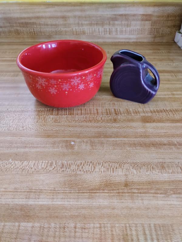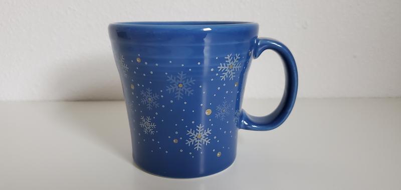 I purchased Fiesta Snowflake dinnerware several years ago. I ordered two more plates and a blue mug in November. This morning when I reheated coffee in the tapered mug I heard popping noises and went to check just when it sparked! I previously ordered two tapered mugs, one blue and one red. The red mug had no marking on the bottom, the two blue mugs have different markings on the bottom. SO disappointed in this purchase. Now I’m concerned about putting the plates in the microwave.