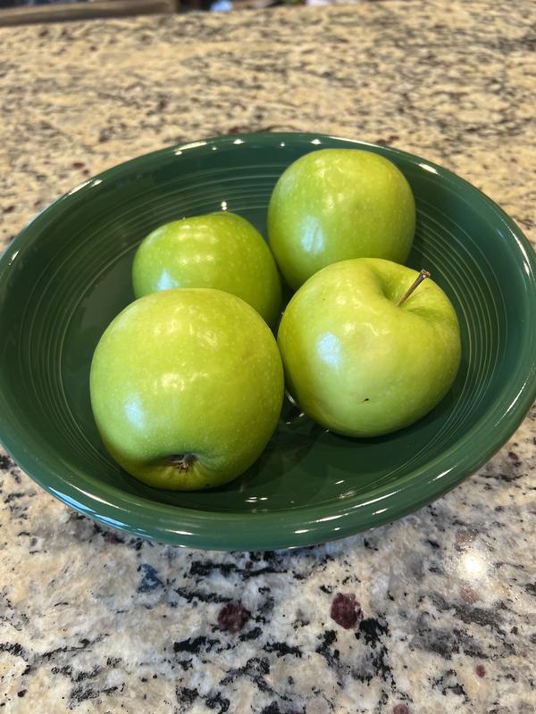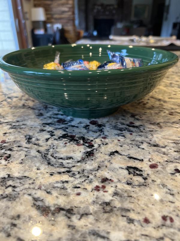 I bought the bowl in evergreen, a nice, rich green. This is a really nice sized, attractive bowl. Could be left out on counter filled with fruit or candy. A neat serving dish as well.