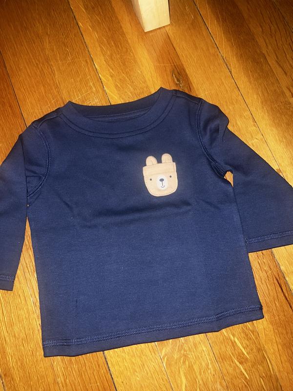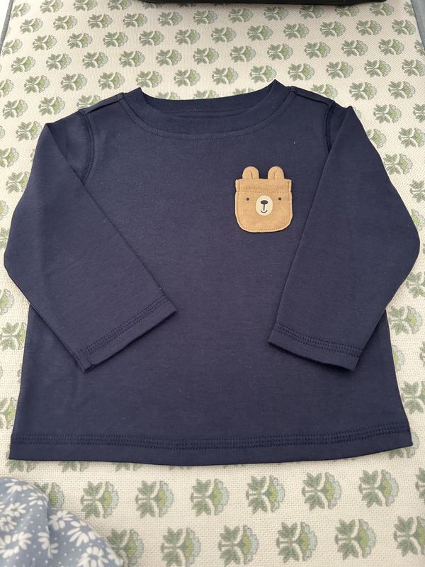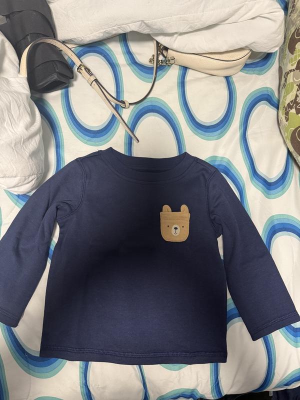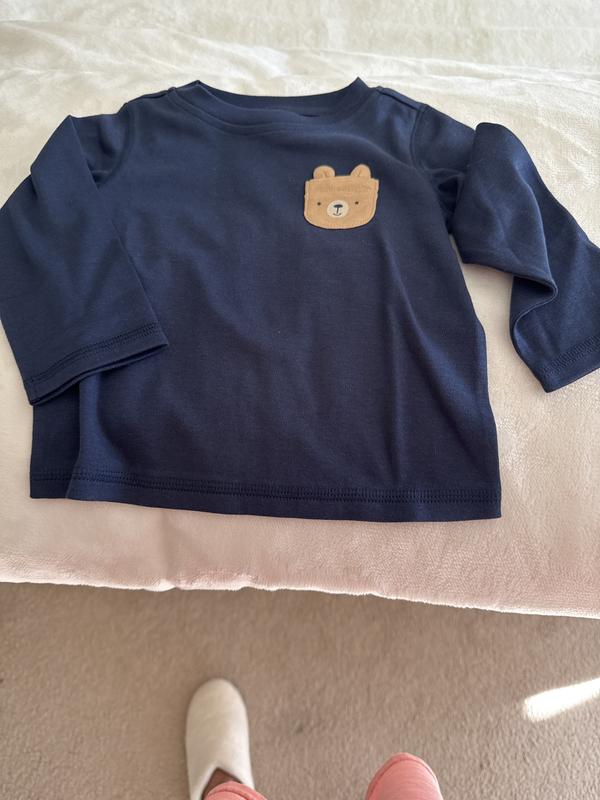 This baby boy shirt is adorable. The fabric is soft. The navy color works well with the cute bear pocket. I am looking forward to giving this as a gift to my daughter who is expecting my first grandson.