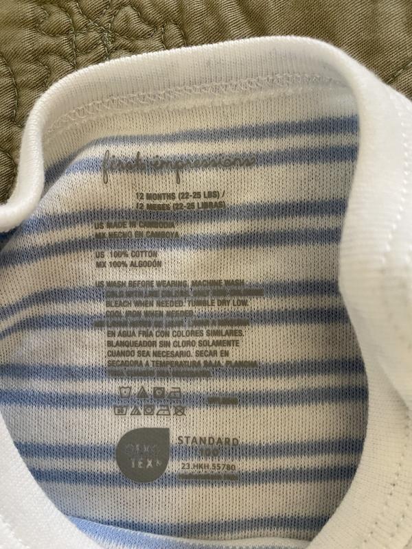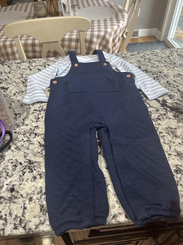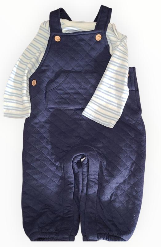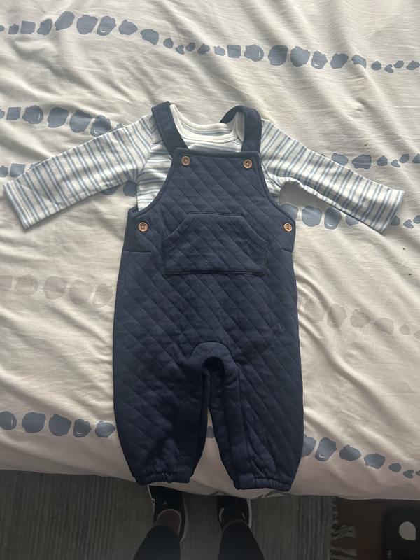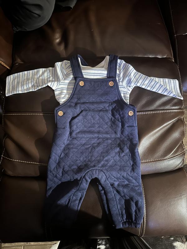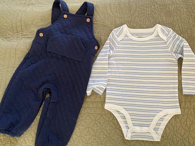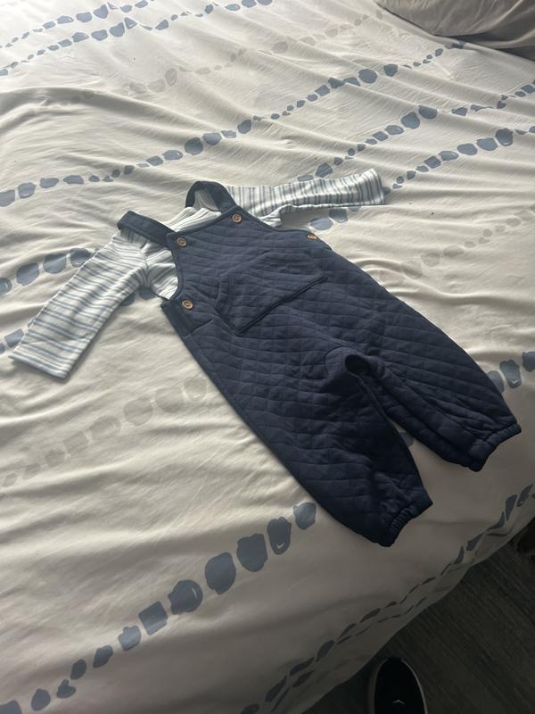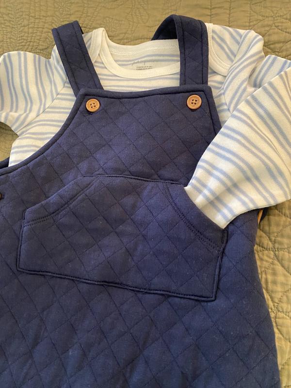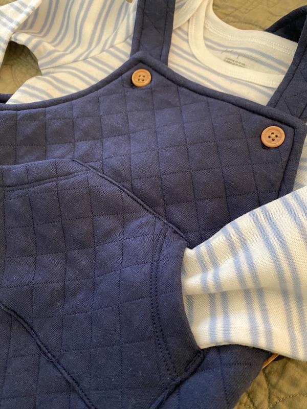 I selected this adorable blue quilted overall set for my grand baby. The cute striped onsie is 100% cotton and the overalls are a cotton blend. My daughter loves this set and will be mixing and matching different pieces as the two pieces are so versatile.
