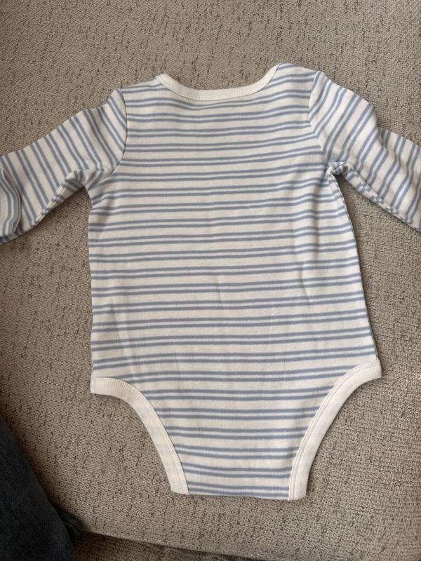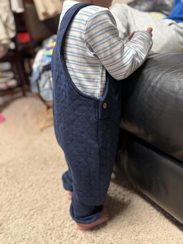 This little overall set is just adorable. I was so excited when it arrived. I got it for my new grandson. I was delighted to see how durable, well-made, and comfy these little overalls and shirt are. The shirt has snaps at the bottom for easy changing, and it has a pattern that will be great for mixing and matching with other pants. The overalls are heavy enough to keep your little one warm and protected. Lots of snaps here as well.