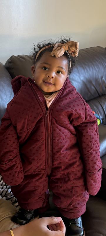 The snowsuit is a little big for our 13 month old. She is tall for her age and outgrew the 9-12 month old. Nevertheless, snowsuit is suitable for winter in New York City. We mostly drive but sometimes take the child out on walks and it does the job of keeping warmth. One inconvenience thing is the middle down zipper, instead of a middle down on the side zipper. It takes some maneuvering to get the child's legs into the suit. Otherwise it does the job and a good option for something used for a few months.