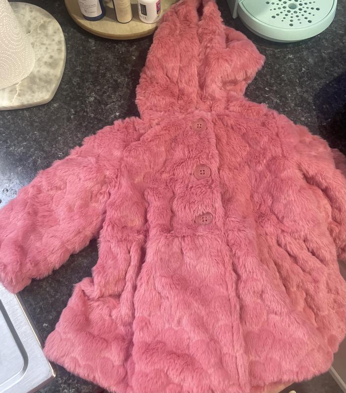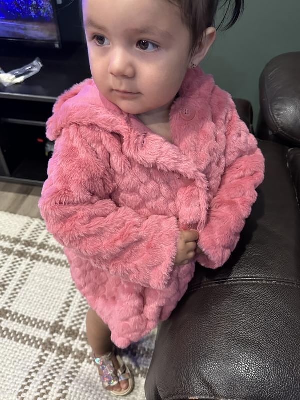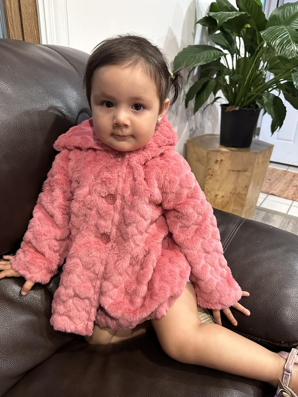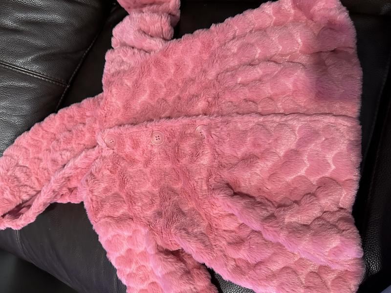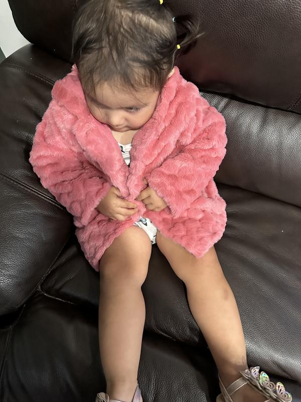 I know my baby is going to look in this faux fur coat and I can’t wait. It’s soft not too soft. The color of the fabric is not too strong, as usual (maybe it’s the standard for babies). It’s true to size and looks even prettier and cuter than the actual picture.