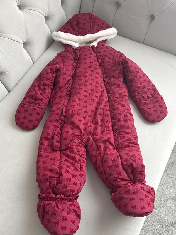 Was thrilled to find this baby girl's snowsuit in a color other than light pink! This shade of red is so pretty without being a bright/primary color. Had to order this online, as my local store was out of the size I needed. It was delivered quickly, but was concerned when tracking info said it would arrive later than initially indicated at the time I ordered it, i.e after Christmas. I was offered the opportunity to upgrade my shipping to get it on time... at an additional cost to me. i did not upgrade, yet it did come in time...