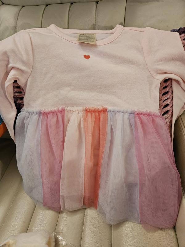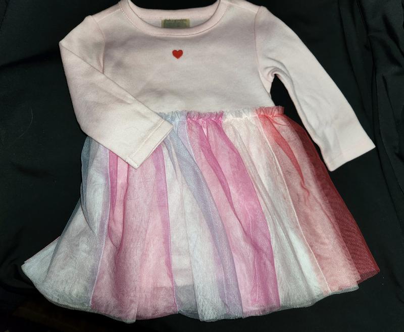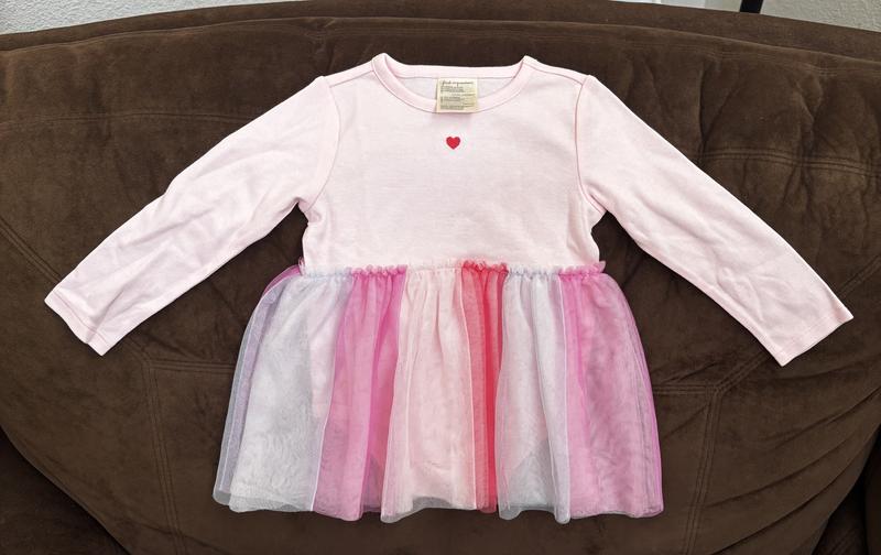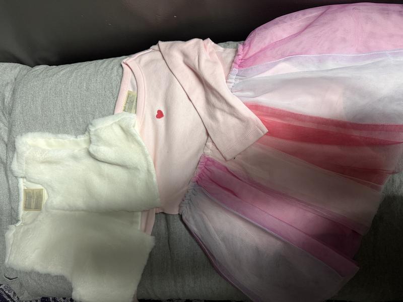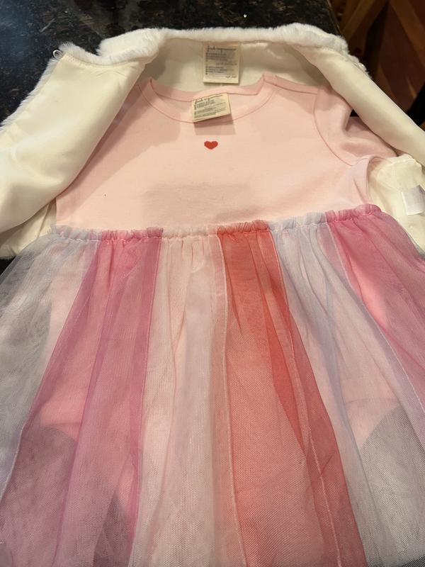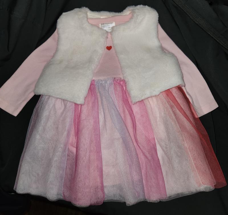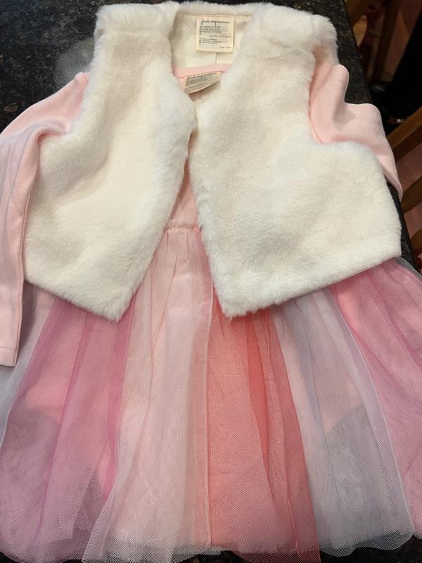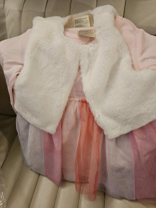 This is an adorable little dress. It will he perfect for Valentines Day. There is a cute little white fur topper. Such a fun little dress. The material is good quality and the colors very pretty and soft.