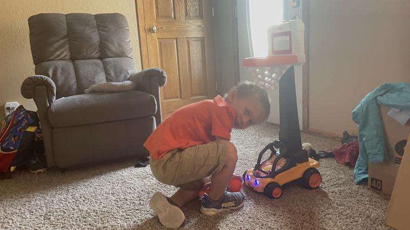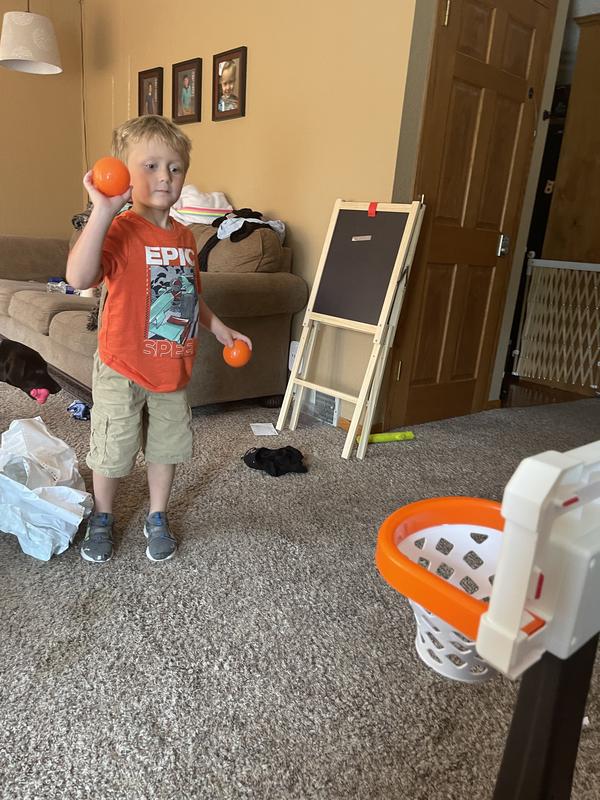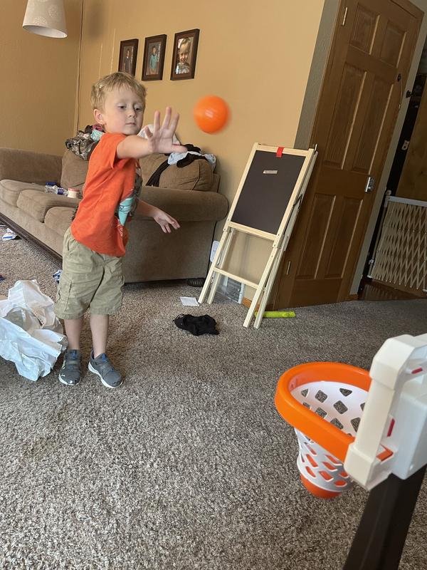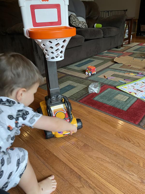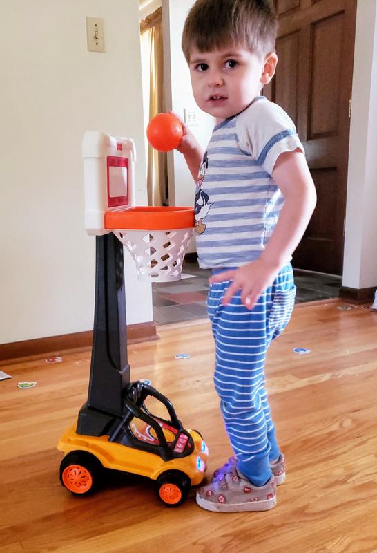 I received this a little over month now and my son loves it. The toy moves front and back. It makes different sounds and it also gives you a timed shoot while moving. Even grownups and older kids can play as a family. Includes 2 basketball to play. Right size height for a toddler to use.
