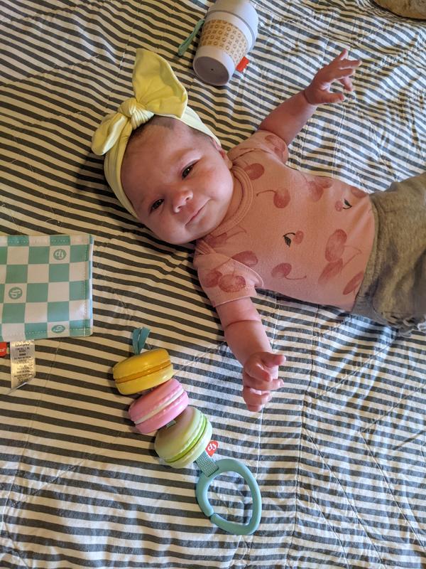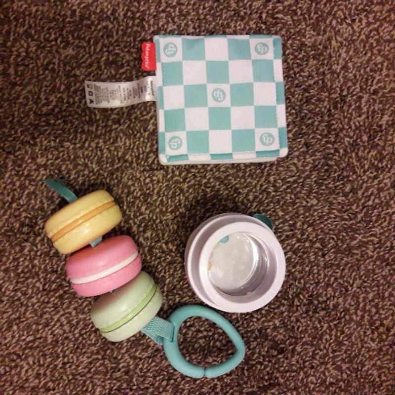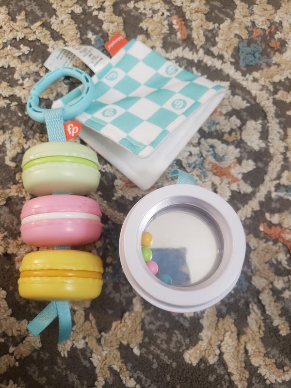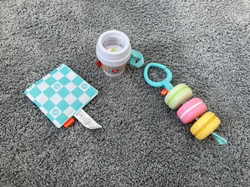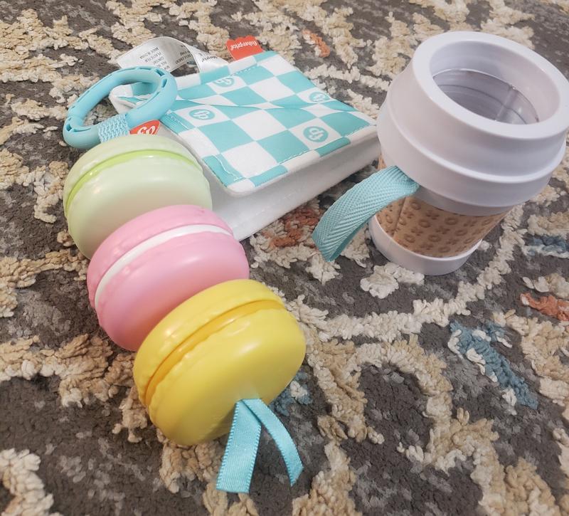 This teething/play set for babies is so cute - a little to-go latte with beads and a mirror, a crinkle napkin, and a string of macarons! High quality, I can tell it will last a long time. I've hung the two larger pieces from the stroller and my baby likes to play with them on walks. He actually loves the crinkle napkin piece the best, I wish it had a tab to hang it from the stroller like the other two toys, though. Overall a great set!